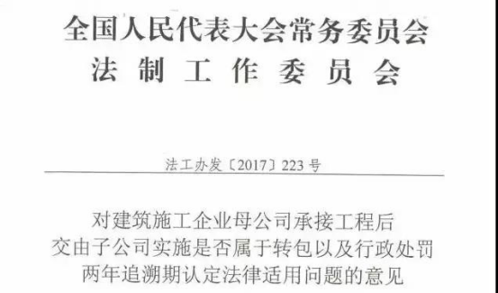 在建筑施工行業(yè),母公司承接工程后交由子公司實施的情況屢見不鮮,該行為是否應認定為轉包,在業(yè)內一直存在不同的說法和認識。2017年,住建部曾向全國人大法工委發(fā)出請示函,全國人大法工委作出《對建筑施工企業(yè)母公司承接工程后交由子公司實施是否屬于轉包以及行政處罰兩年追溯期認定法律適用問題的意見》(法工辦發(fā)[2017]223號,以下簡稱《意見》)認為:關于母公司承接建筑工程后將所承接工程交由其子公司實施的行為是否屬于轉包的問題...