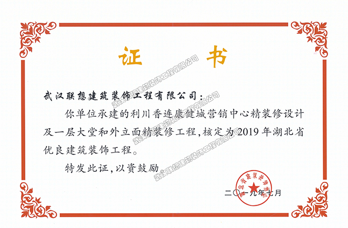 2019年湖北省優(yōu)良建筑裝飾工程(利川香連康健城營(yíng)銷中心精裝修設(shè)計(jì)及一層大堂和外立面精裝修工程)