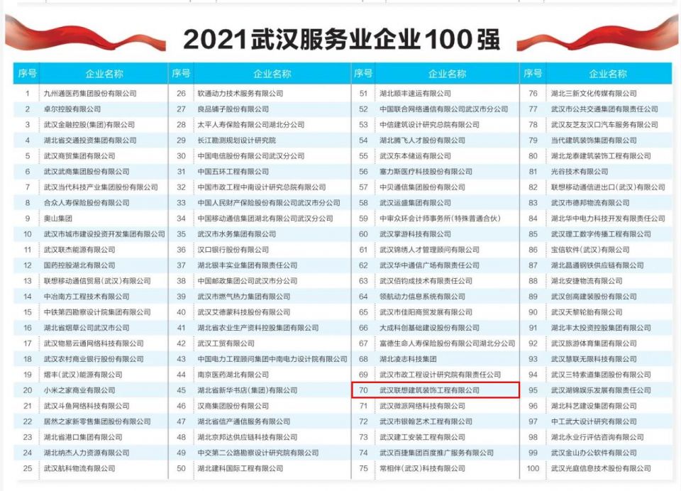 近日,武漢企業(yè)聯(lián)合會(huì)發(fā)布“2021武漢服務(wù)業(yè)企業(yè)100強(qiáng)”企業(yè)名單,武漢聯(lián)想建筑裝飾工程有限公司成功入選,這是聯(lián)想全體人員拼搏奮斗的榮譽(yù),我們會(huì)再接再厲,再創(chuàng)輝煌,取得更驕傲的成績!