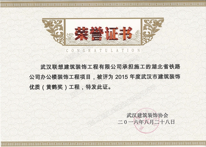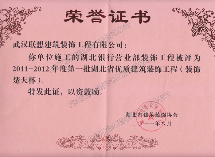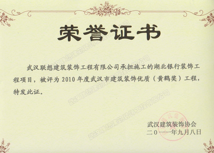 2010年度武漢建筑裝飾優(yōu)質(zhì)工程黃鶴杯(湖北銀行裝飾工程)