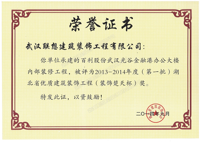 2013-2014年度湖北省優(yōu)質(zhì)建筑裝飾工程楚天杯(百利股份武漢光谷金融港辦公樓裝修工程)