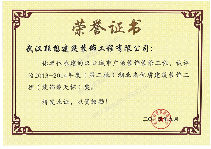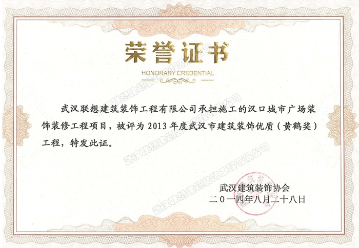 2013年度武漢市建筑裝飾優(yōu)質(zhì)工程黃鶴杯(漢口城市廣場裝飾裝修工程)