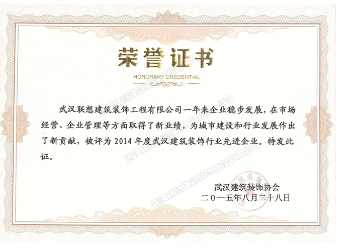 2014年度武漢建筑裝飾行業(yè)先進(jìn)企業(yè)