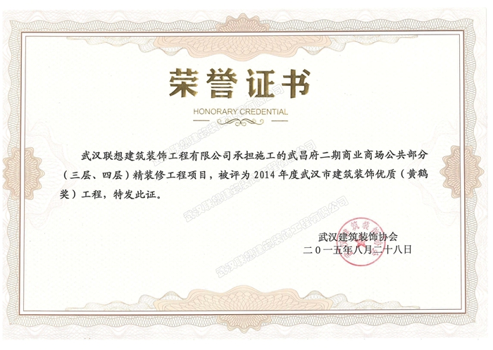 2014年度武漢市建筑裝飾優(yōu)質(zhì)工程黃鶴杯(武昌府二期商業(yè)商場公共部分三四層精裝修工程)