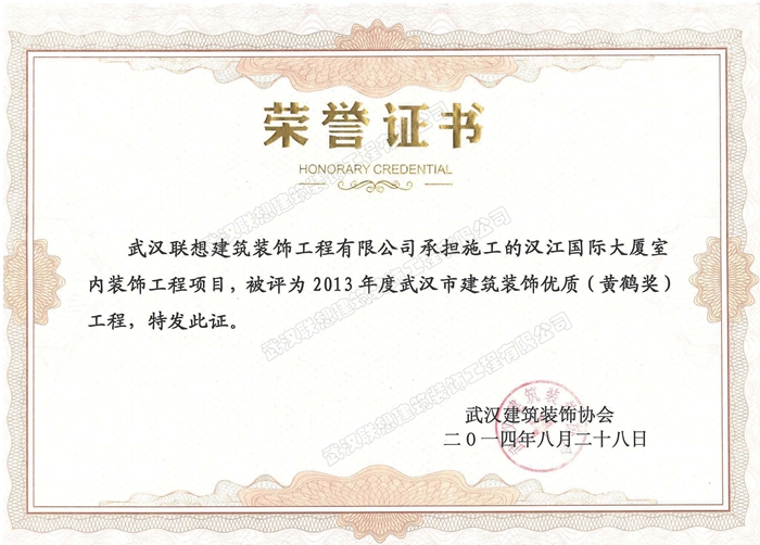 2013年度武漢市建筑裝飾優(yōu)質(zhì)工程黃鶴杯(漢江國際大廈室內(nèi)裝飾工程)