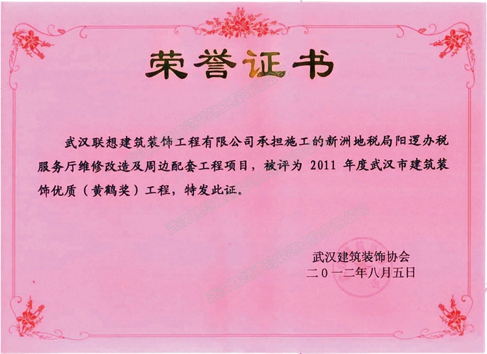 2011年度武漢建筑裝飾優(yōu)質(zhì)工程黃鶴杯(新洲地稅局陽邏辦稅服務(wù)廳維修改造及周邊配套工程)